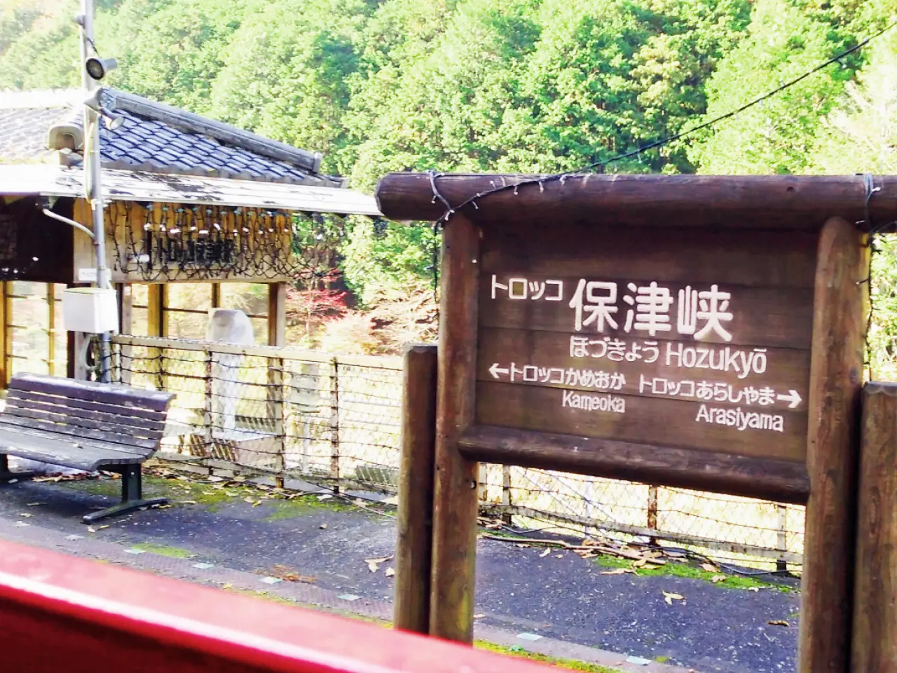 Torokko Hozukyo Station is an unmanned station located in a ravine, with multiple obstacles on the way to the platform including multiple sets of stairs and a suspension bridge.