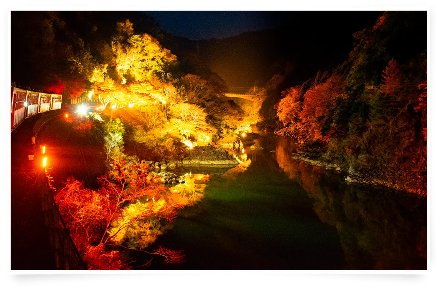 暮れゆく保津峡の山々と川の流れをより一層上質に演出するライトアップ&イルミネーションで、昼間とは違う期間限定の幻想的な絶景を楽しめます。