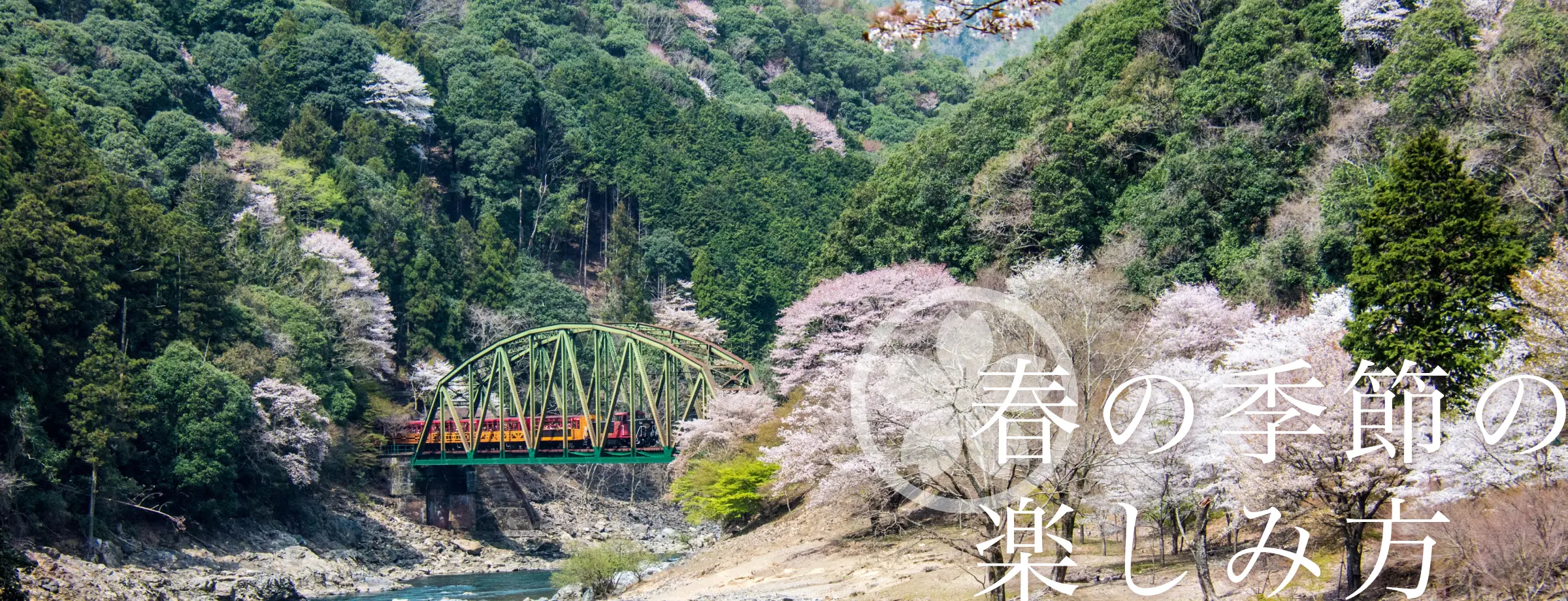 春の嵯峨野トロッコ列車は、満開の桜と新緑が彩る美しい風景が広がります。