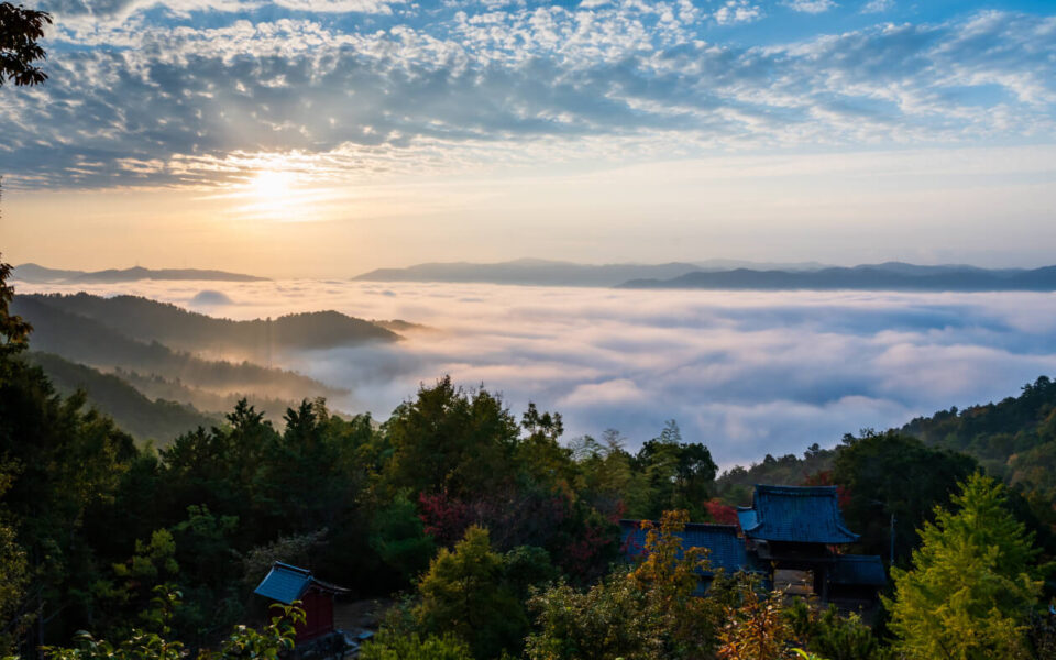 獨鈷拋山 千手寺位於俯瞰龜岡市的山上,是一座被美麗自然環繞的寺廟。特別是寺廟位於高海拔的山頂上,常常可以看到晨霧和雲海。如果您一大早前來參觀,還可以欣賞到群山間展開的夢幻般的雲海。寧靜的群山和雲海相互融合,呈現出壯麗的景色,彷彿漂浮在天空中,擄獲來訪者的心。