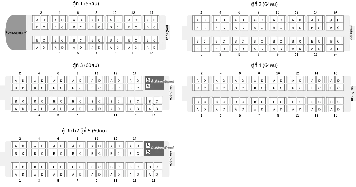 ตู้ที่ 1-4 เป็นตู้รถไฟทั่วไป มีที่นั่งแบบบ็อกซ์ 4 ที่นั่งพร้อมหน้าต่าง ดัดแปลงมาจากรถไฟขนส่งสินค้าโบราณ ให้ความรู้สึกย้อนยุคด้วยเก้าอี้ไม้และหลอดไฟเปลือย เมื่อเปิดหน้าต่างกว้าง จะรู้สึกถึงสายลมและเสียงธรรมชาติ นำพาสู่บรรยากาศแสนสบายที่แตกต่างจากชีวิตประจำวัน